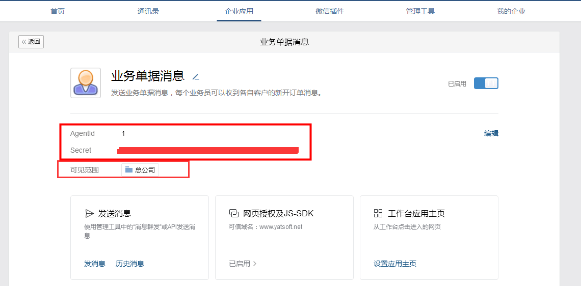 在企业微信“我的应用”内增加应用“业务单据消息”并设置应用可见范围,应用创建成功后,在应用详情界面可以查看企业应用 Agentld 以及企业应用 Secret,如下图所示。
