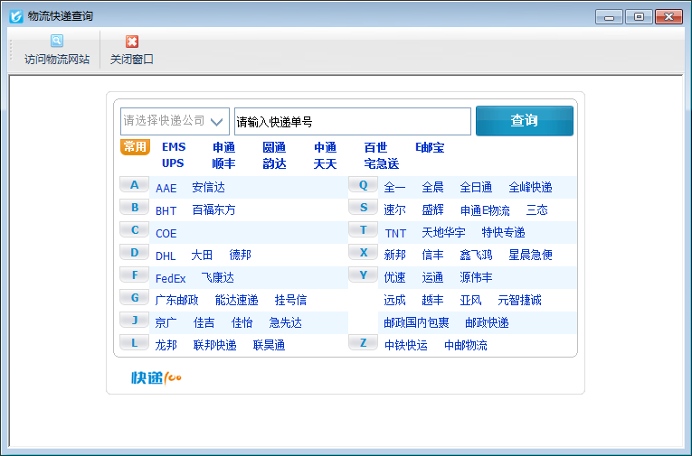 在功能导航窗点“扩展应用”—》“快递查询”即可进入“物流快递查询”界面,如下图所示: