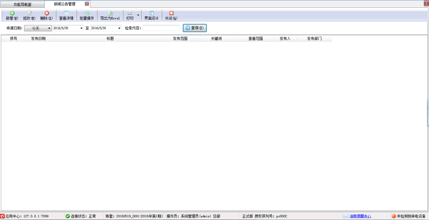 在功能导航窗点击“扩展应用”—》“新闻公告管理”即可进入“新闻公告管理”界面,如下图所示: