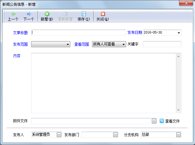 新增新闻公告:点击工具栏的“新增”按钮即可新增新闻公告,可以选择“发布范围”及“查看范围”,发布在“内部”时,有查看权限的操作员登录系统后即可查看到已发布的新闻公告,发布在“客户服务平台”时,客户账号在“订货管家”系统内可以查看到已发布的新闻公告。