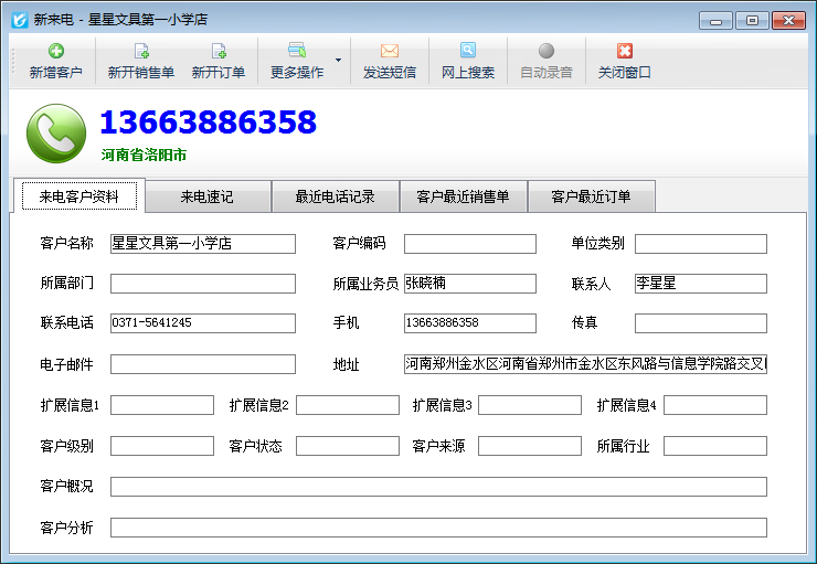 来电弹屏:客户来电时,来电弹屏窗口会自动显示出在“基础资料”——》“客户资料”内维护好的此客户的相关信息、客户最近电话记录、客户最近销售单及客户最近订单,使得您可以在通话之前可以全面了解客户信息。