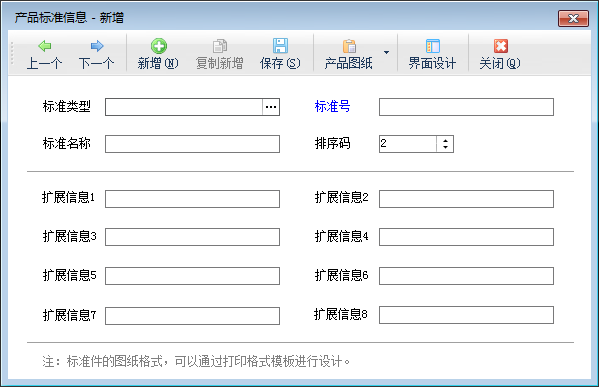 打印:在工具栏点“打印”—》“打印”可以快速打印产品标准列表;点“打印格式设计”可以打开“打印格式设置”窗口,可以新增、修改、删除打印格式模板。