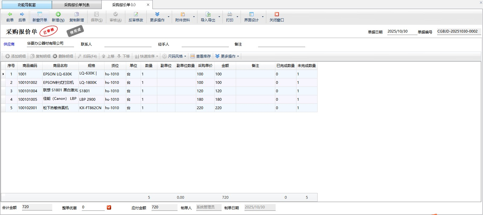 采购报价单用于管理采购询价信息,相对于采购订单,报价单的采购意向更弱。在采购订单和采购入库单中可以调取引用采购报价单。