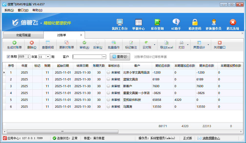 审核:点工具栏中的“审核”按钮,可以对“待审核”的对账单进行审核,已审核的对账单不允许随意修改,如需修改清先进行反审。