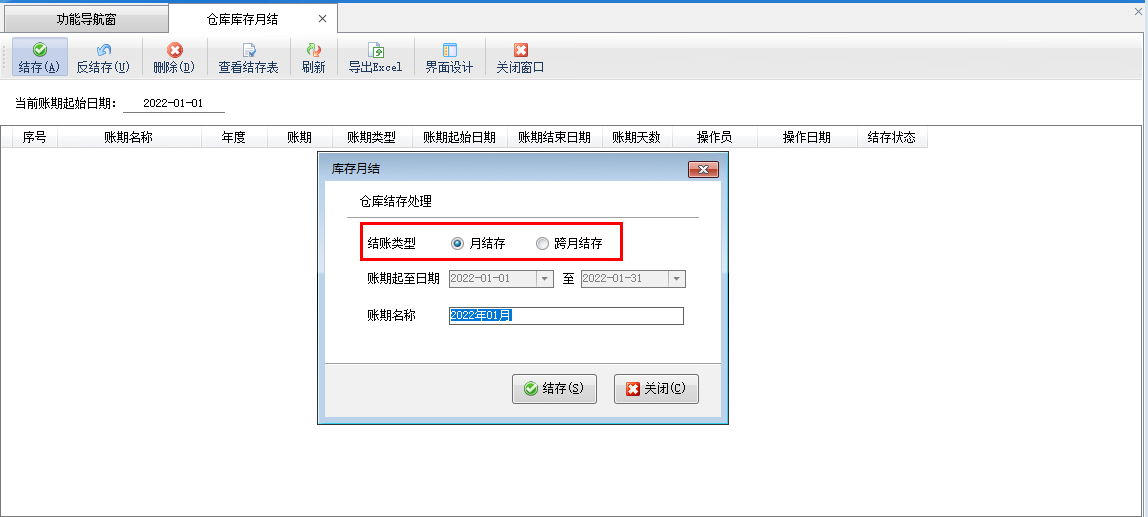 库存月结功能支持按月或者跨月多业务进行结存操作,如下图所示: