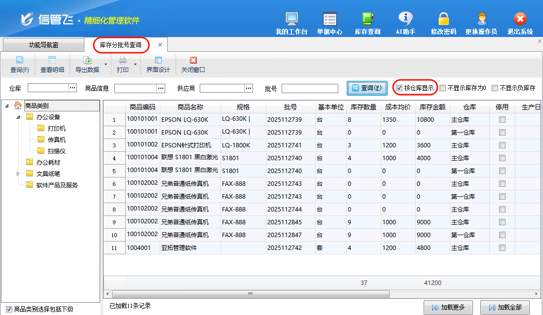 功能导航窗选择“仓库管理”,仓库管理界面右侧相关统计查询中打开“库存分批号查询”。库存分批号查询界面显示所有批号商品的库存数量,默认按仓库进行显示,如下图所示: