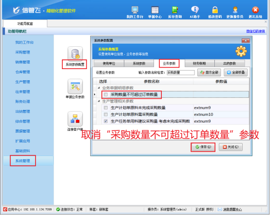 在采购业务里,不少客户会先按需求开采购订单,采购人员再依单采购入库。但实际采购时,常出现采购数量大于订单数量的情况,当出现这种情况后,部分客户在进行开单时,会因系统限制,提示采购数量超限而无法保存单据。别担心,信管飞RMS软件能轻松化解这一难题! 简单设置,开启灵活采购 只需在功能导航窗依次点击“系统管理”—“系统参数配置”—“业务参数”,进入“业务参数”界面,取消勾选“采购数量不可超过订单数量”参数,然后点击“保存”按钮,配置就完成啦,操作简单又快