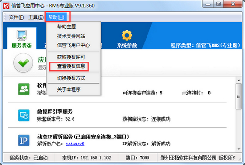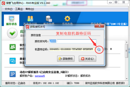 以信管飞RMS专业版为例,软件安装后桌面上有两个图标,红色是软件应用中心,蓝色是客户端程序,电脑机器特征码需要在应用中心内查看,打开软件应用中心,点击菜单“帮助”->“获取授权许可”,在“获取授权许可”界面可查看电脑特征码,然后将机器特征码发给客服人员,由客服帮您申请授权即可,如下图所示。