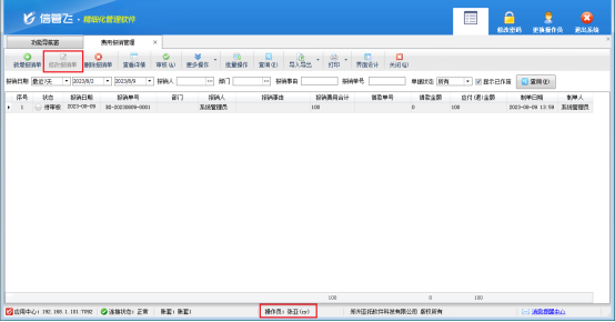 权限设置完成后,使用操作员“张亚”登录软件,打开费用报销管理界面,可以看到工具栏“修改”按钮为灰色的,操作员无法修改费用报销单。如图所示: