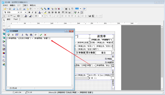 出库单打印模板上显示订单累计数量,在开单界面打印下选择“打印格式设计”,进入打印格式设计界面,点击设计格式,进入模板设计器界面添加累计数量,调用数据项:[[单据明细."已完成订单量"] + [单据明细."数量"]],如下图所示: