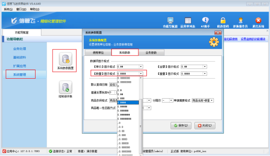 在功能导航窗点击“系统管理”—》“系统参数配置”—》“系统参数”,在“系统参数”界面可以设置数据项显示格式,调整数量显示格式扩展数值的也会改变,设置完之后点击“保存”按钮保存配置,如下图所示: