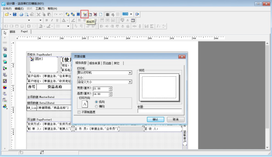 在单据开单界面选择打印—》打印格式设计—》设计格式,进入打印模板的设计器界面,菜单栏设置中点击添加页,可以设置添加页面的大小和打印方向,如下图所示: