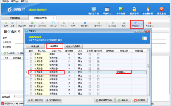 2.进入界面设计的单据明细设置板块,勾选需要显示的扩展信息项(如扩展信息 1),名称可自定义修改;