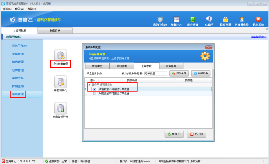 在软件功能导航窗,依次点击“系统管理”—》“系统参数配置”—》“业务参数”,进入业务参数设置界面后,勾选“销售数量不可超过订单数量”这一参数,点击“保存”按钮,即可完成全部配置。