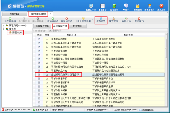 在日常开单过程中,操作员可能会遇到这样的困扰——已打印过的单据需要修改后重新打印时,系统却提示超出打印次数限制,导致无法再次打印,既影响效率又让人着急。别担心,信管飞软件为您提供了简单有效的解决方案! 方案一:给操作员开通特权 一、进入授权界面